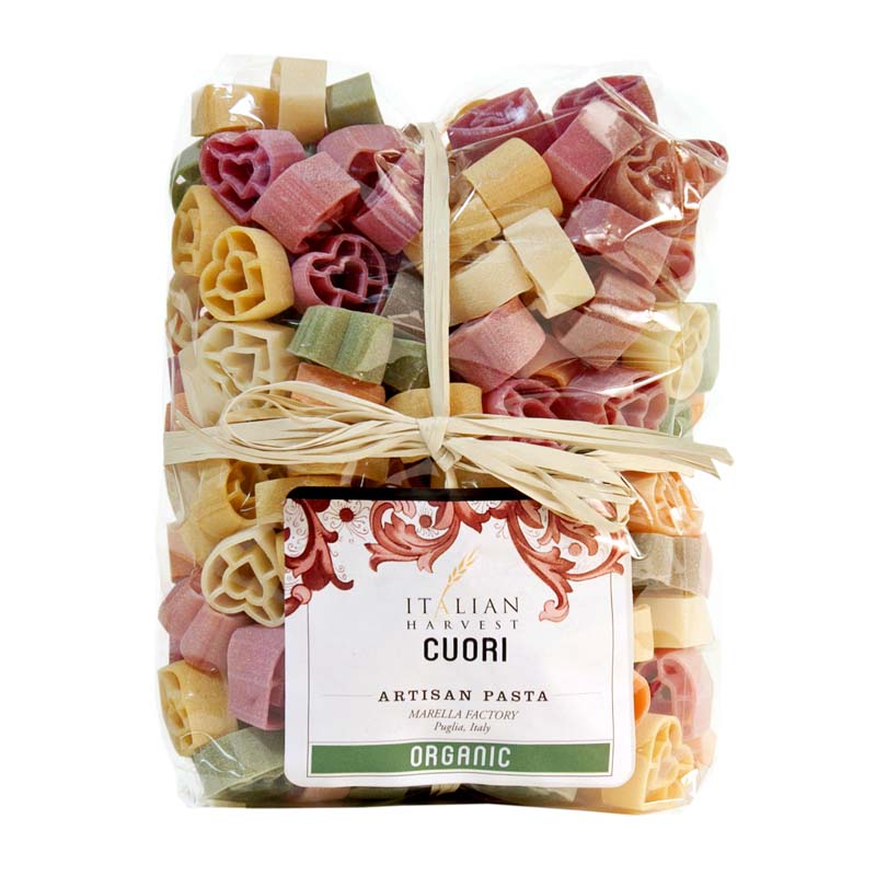 Natural dyes add bright colors to this romantic colorful hearts Marella creation. *Organic Marella Pasta imported by Italian Harvest is a 2013 Silver sofi Award Winner for "Outstanding Product Line".